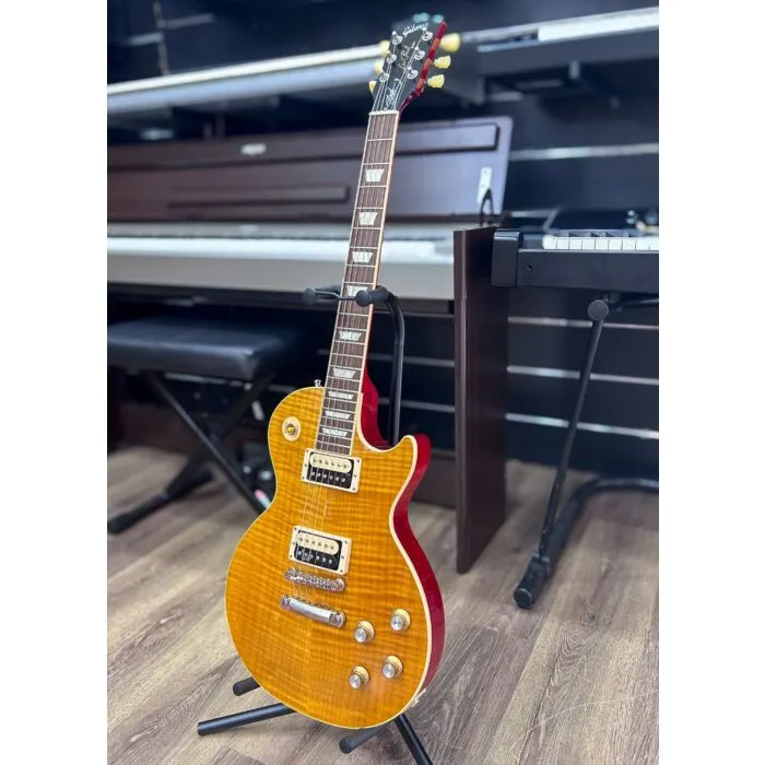A Gibson Les Paul Model Slash - Appetite Burst é uma guitarra signature criada em colaboração com o lendário guitarrista do Guns N' Roses. Este modelo usado mantém todas as características que o tornam uma das guitarras mais desejadas do mundo, oferecendo o tom, estilo e desempenho que definiram o rock clássico.