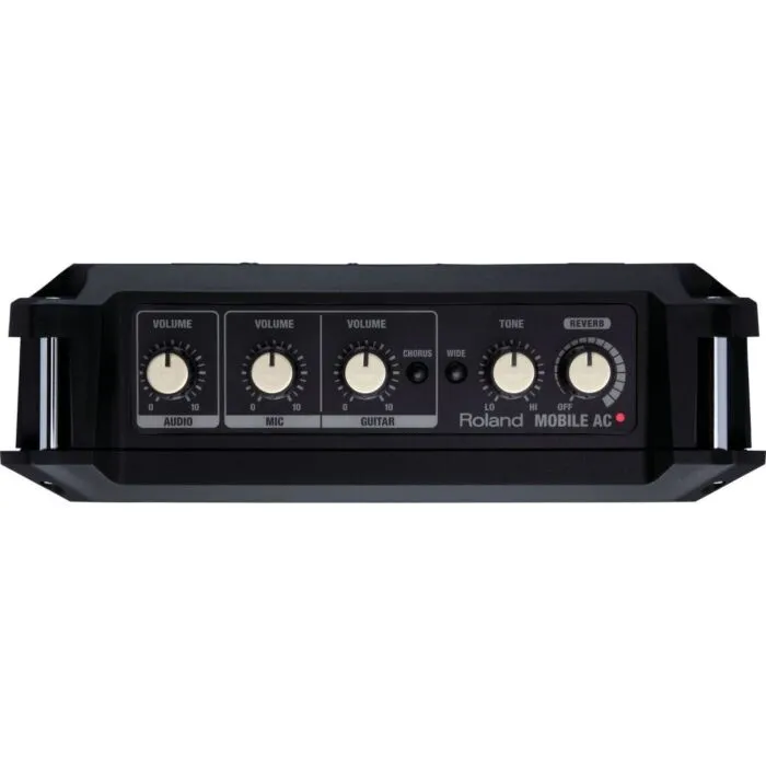 O Mobile-AC possui um alto-falante de 10 cm (4 polegadas) x 2, que oferece uma excelente qualidade de som, mesmo em volumes mais altos. Ele também possui uma série de controles que permitem ajustar o som de acordo com as suas preferências, incluindo um interruptor POWER, um interruptor WIDE, um botão TONE, um botão REVERB, um botão VOLUME para áudio, um botão VOLUME para microfone e um botão VOLUME para guitarra. Além disso, ele possui um interruptor REFRÃO, que permite adicionar um efeito de refrão ao som.