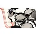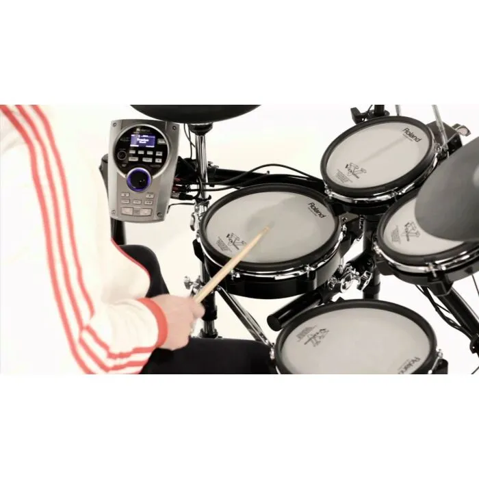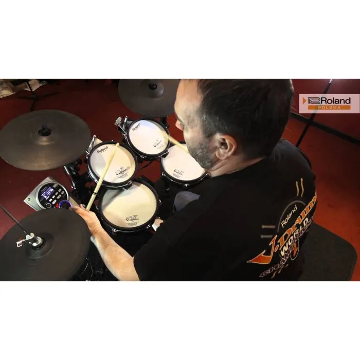 O kit TD-15KV inclui quatro pads de bateria V-Pad, que oferecem uma sensação de tocar bateria acústica. O pad de caixa PDX-100 e os pads de tom PD-85BK reproduzem com precisão os sons e a sensibilidade de uma caixa e toms acústicos. Além disso, o kit inclui um pad de chimbal VH-11, que oferece uma resposta realista e sensível ao toque, e um prato de ataque CY-12C e um prato de condução CY-13R, que proporcionam uma sensação autêntica de tocar pratos de bateria.