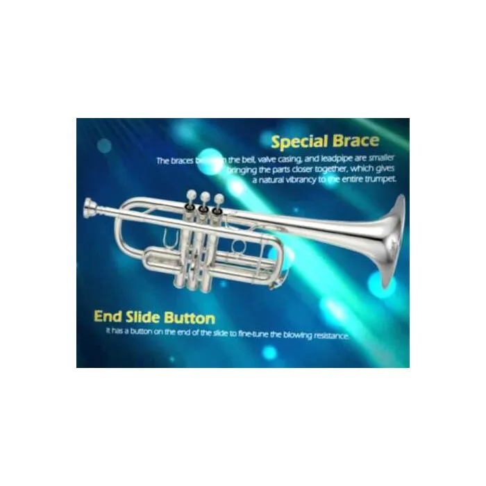 O sino do trompete tem um diâmetro de 123mm (4-7/8), o que contribui para um som aberto e ressonante. Além disso, o tamanho do orifício é de 11,73mm (0,462), o que permite uma resposta rápida e uma projeção excepcional.